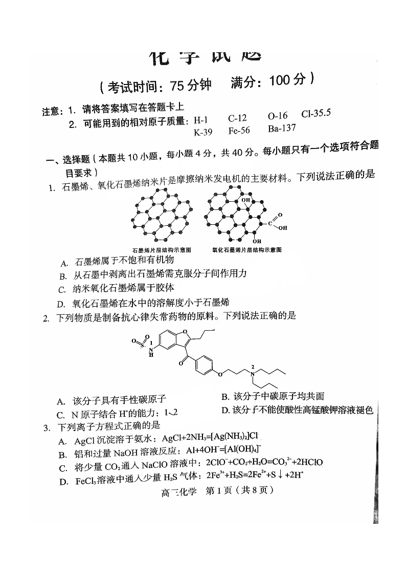 福建省龙岩市2024-2025学年下学期五月高三教学质量检测化学