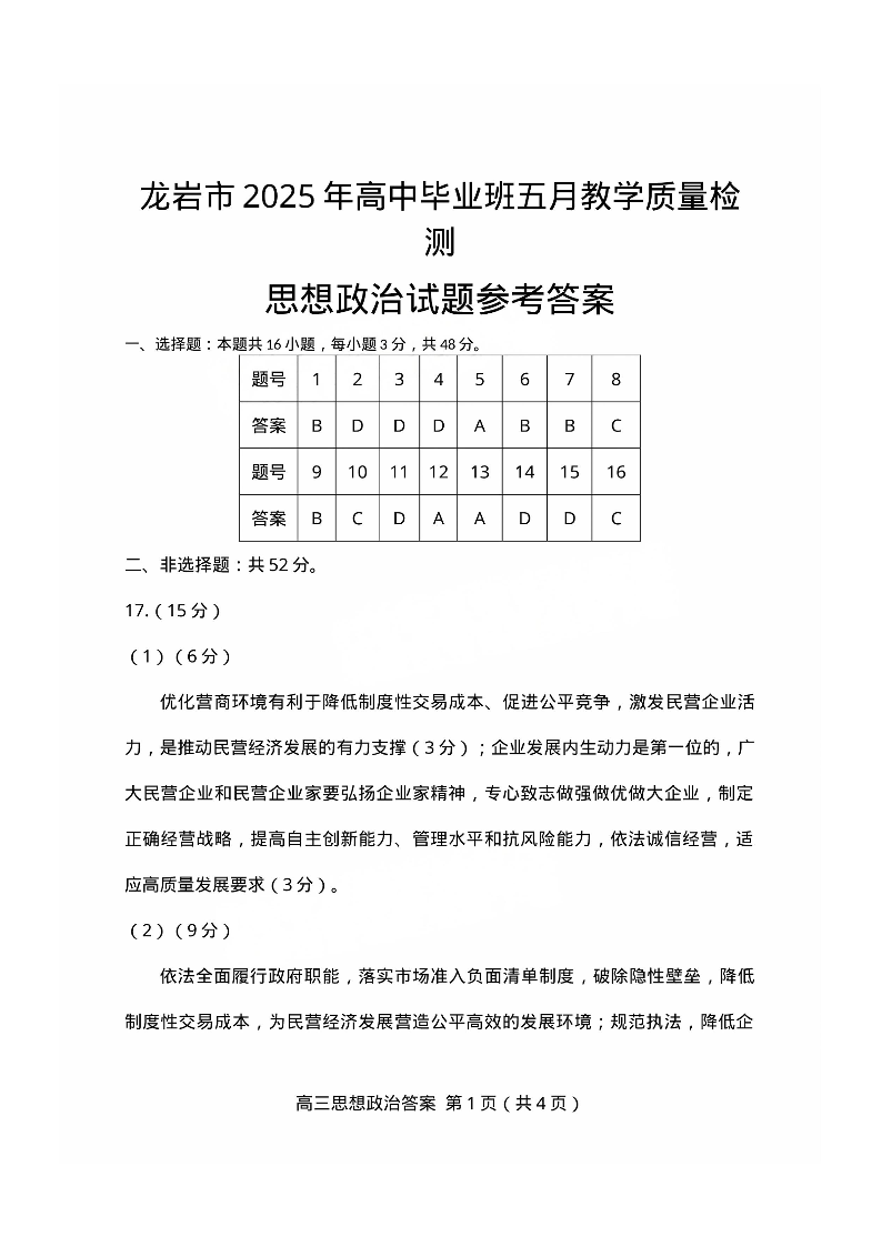 福建省龙岩市2024-2025学年下学期五月高三教学质量检测政治答案