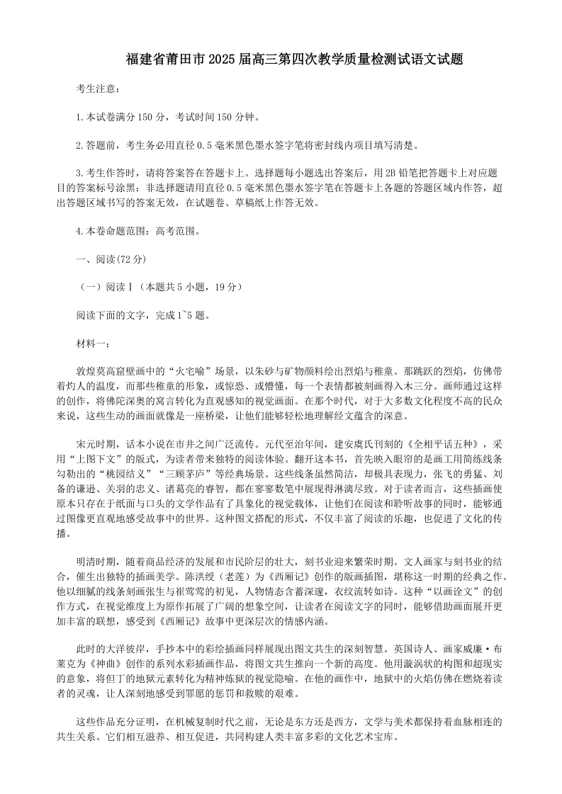 福建省莆田市2024-2025学年下学期高三第四次教学质量检测语文+答案