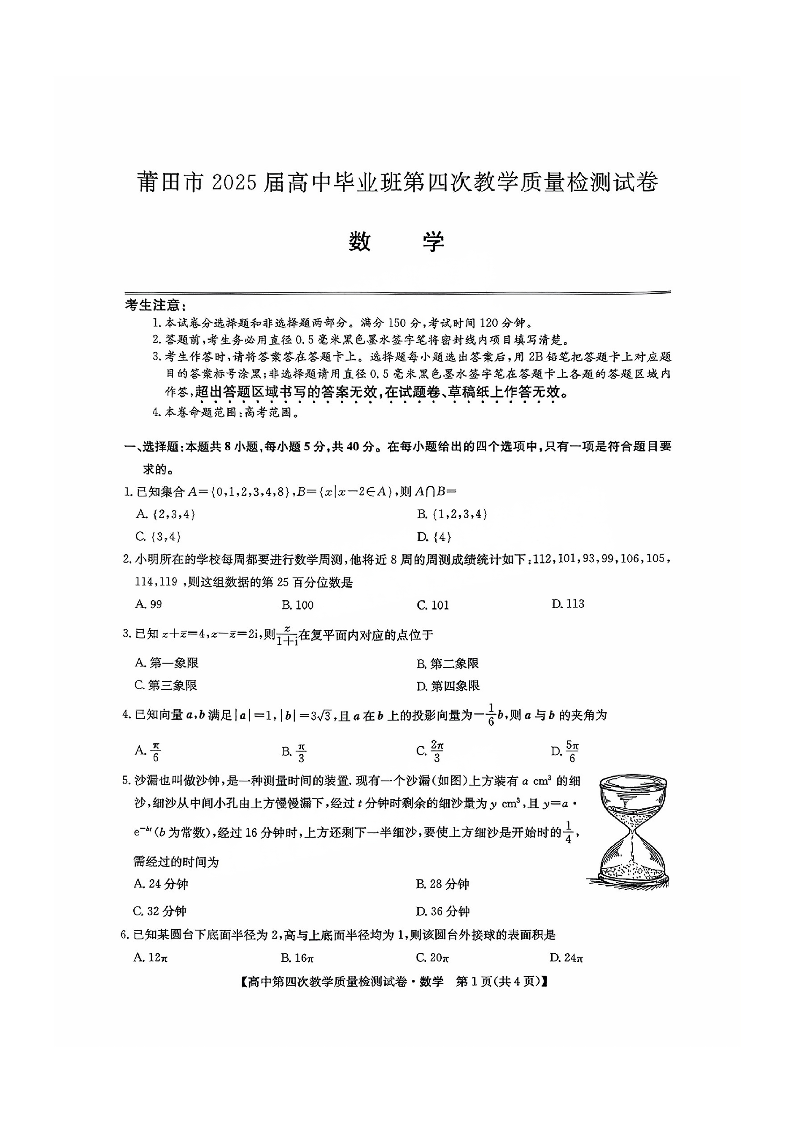 福建省莆田市2024-2025学年下学期高三第四次教学质量检测数学