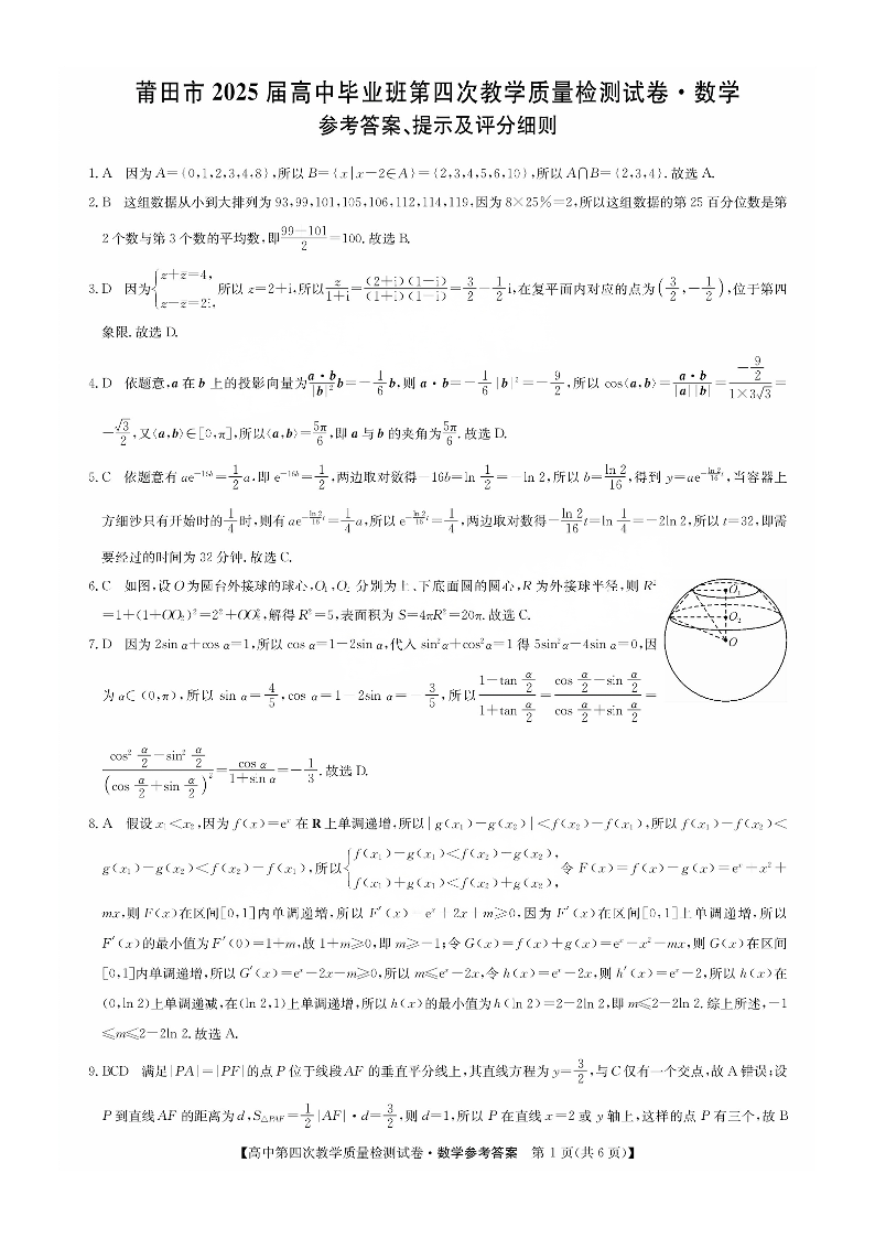 福建省莆田市2024-2025学年下学期高三第四次教学质量检测数学答案
