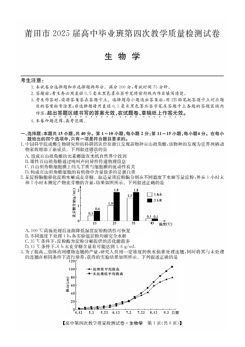 福建省莆田市2024-2025学年下学期高三第四次教学质量检测生物