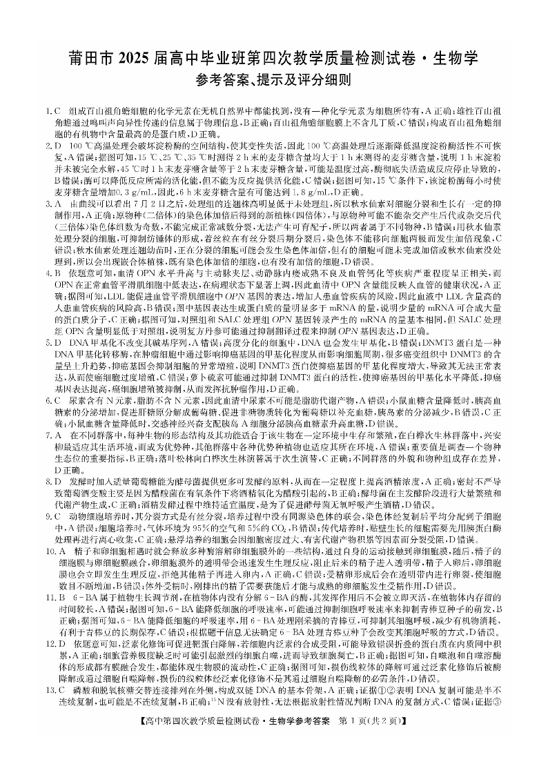 福建省莆田市2024-2025学年下学期高三第四次教学质量检测生物答案