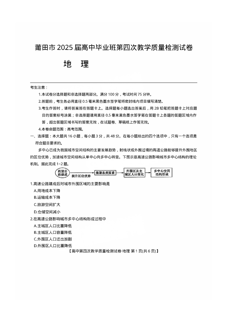 福建省莆田市2024-2025学年下学期高三第四次教学质量检测地理