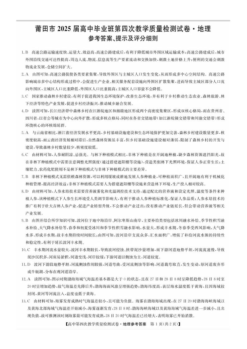 福建省莆田市2024-2025学年下学期高三第四次教学质量检测地理答案