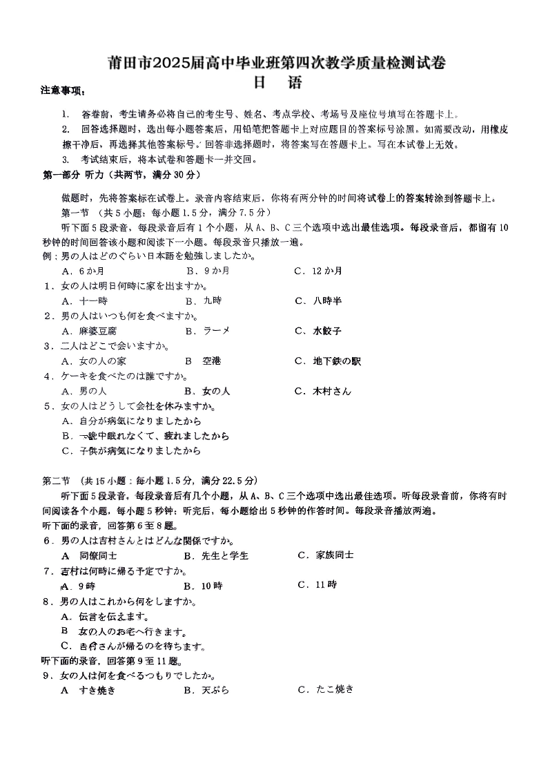 福建省莆田市2024-2025学年下学期高三第四次教学质量检测日语