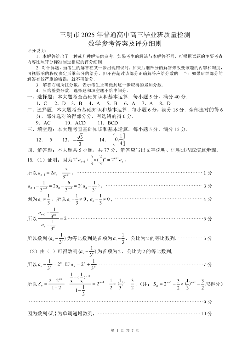 福建省三明市2024-2025学年下学期高三质量检测数学答案