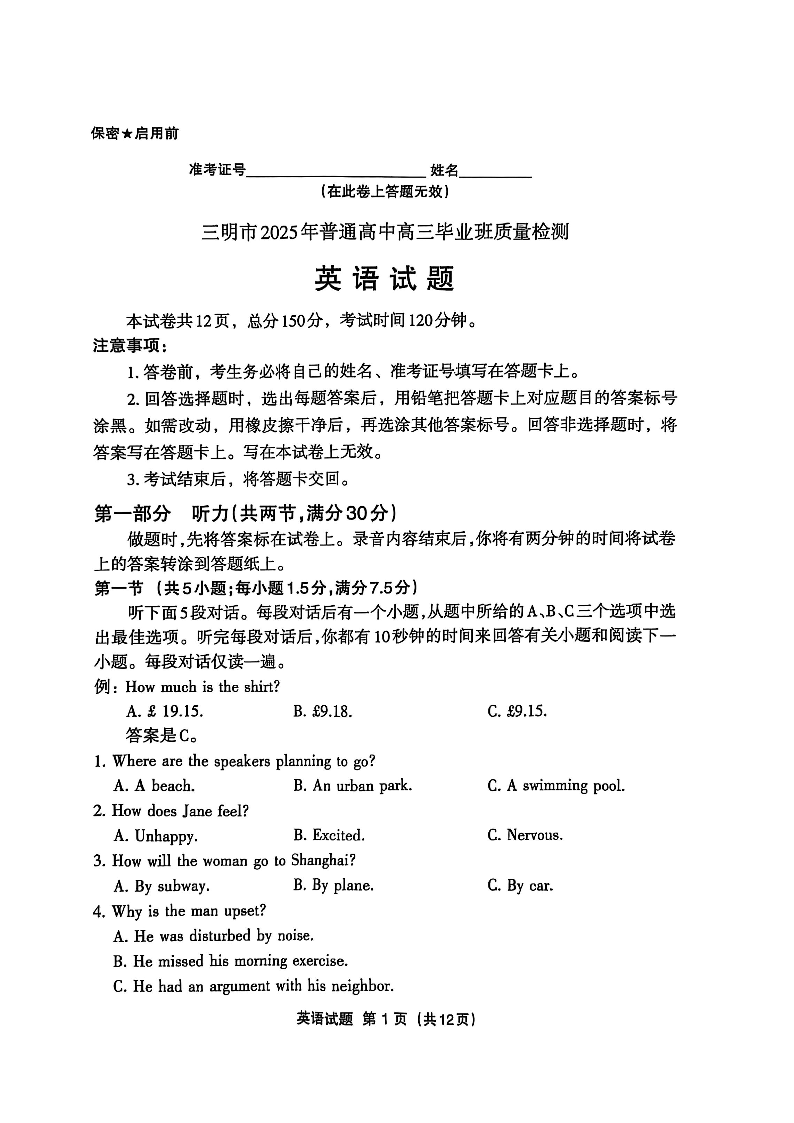 福建省三明市2024-2025学年下学期高三质量检测英语