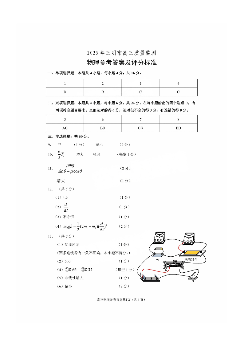 福建省三明市2024-2025学年下学期高三质量检测物理答案