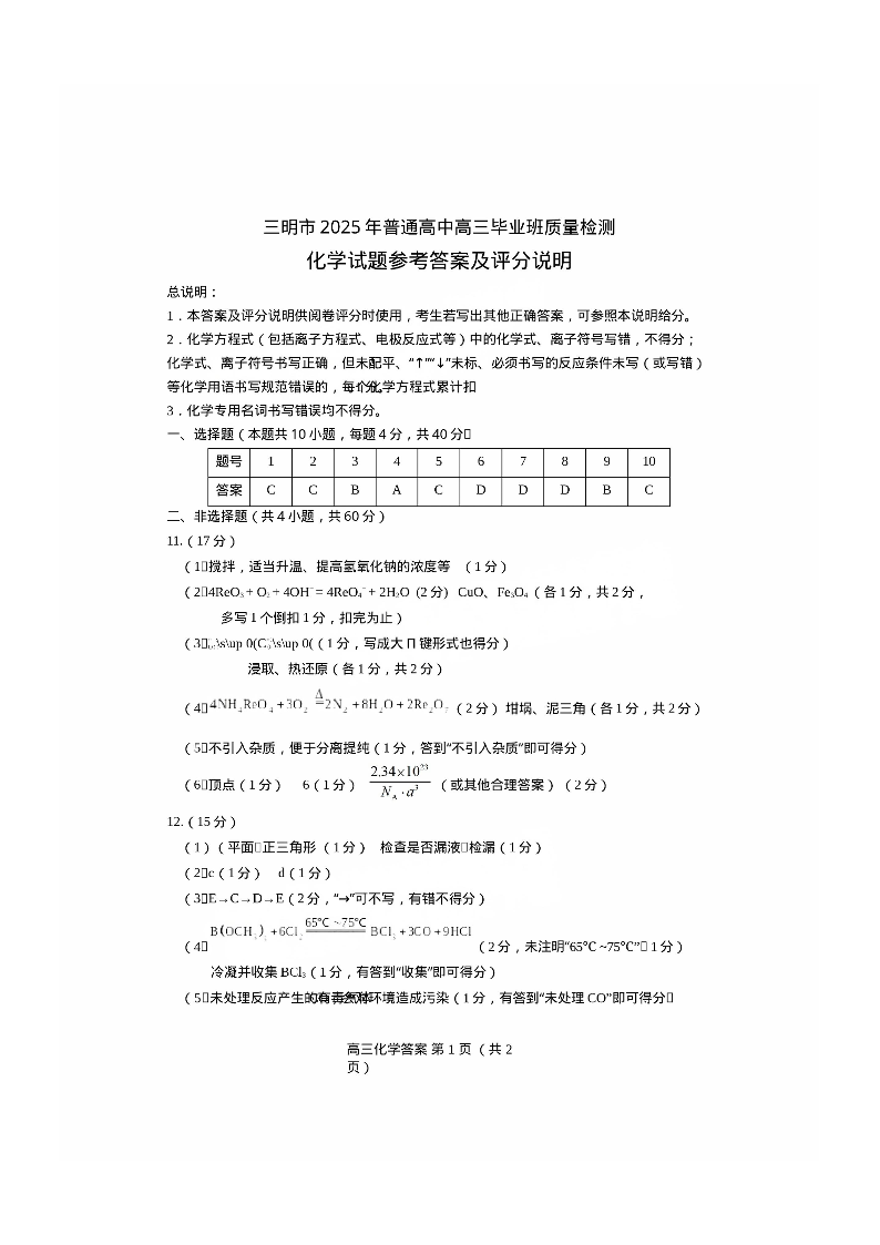 福建省三明市2024-2025学年下学期高三质量检测化学答案