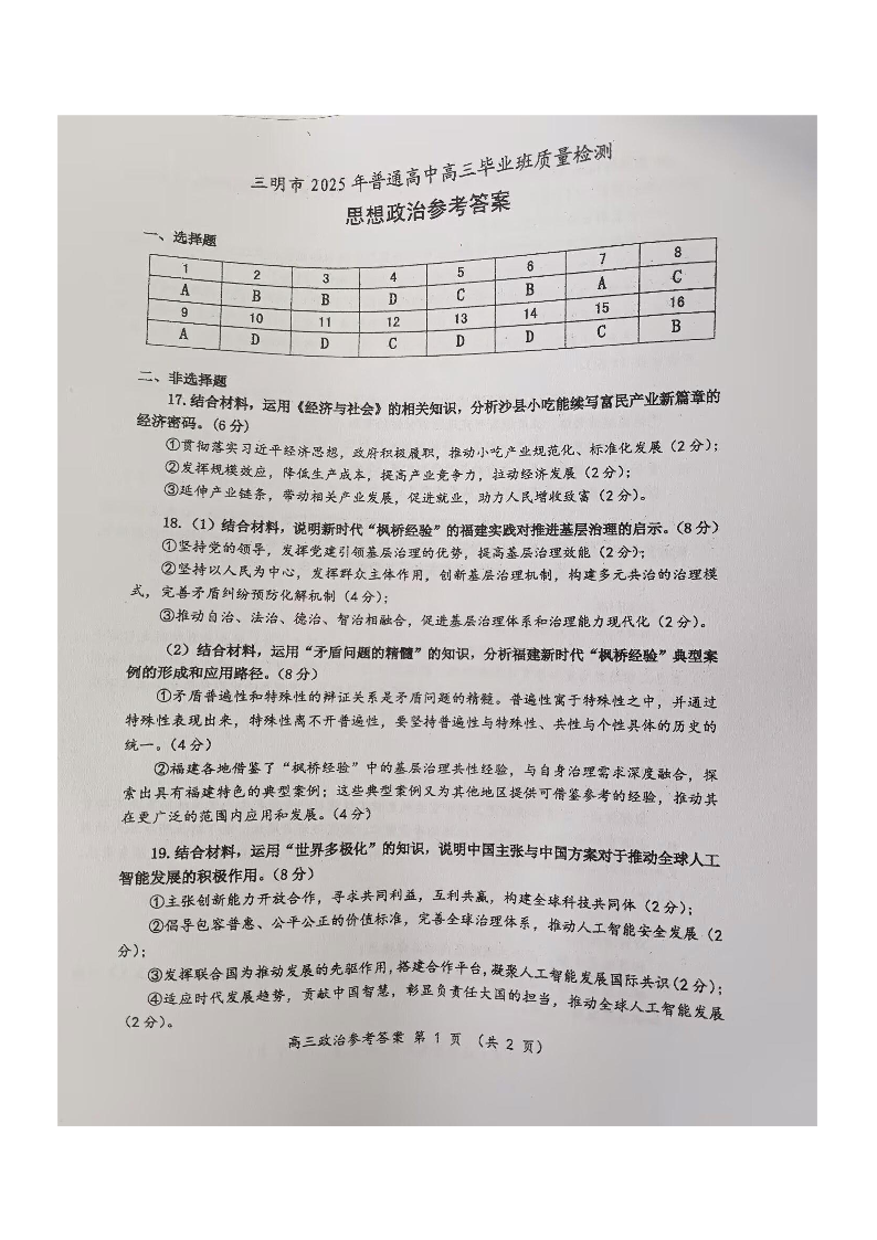 福建省三明市2024-2025学年下学期高三质量检测政治答案