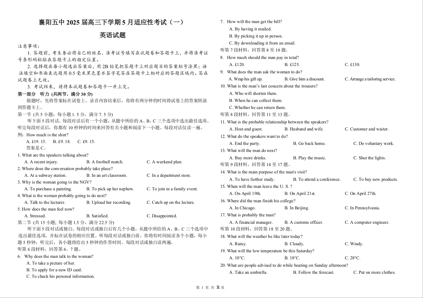 湖北省襄阳五中2024-2025学年下学期5月高三适应性考试(一)英语