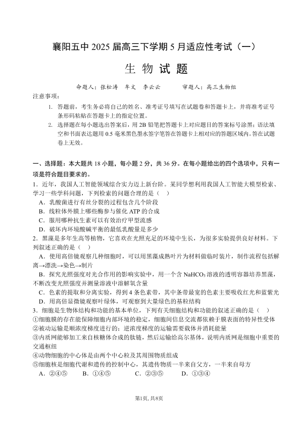 湖北省襄阳五中2024-2025学年下学期5月高三适应性考试(一)生物