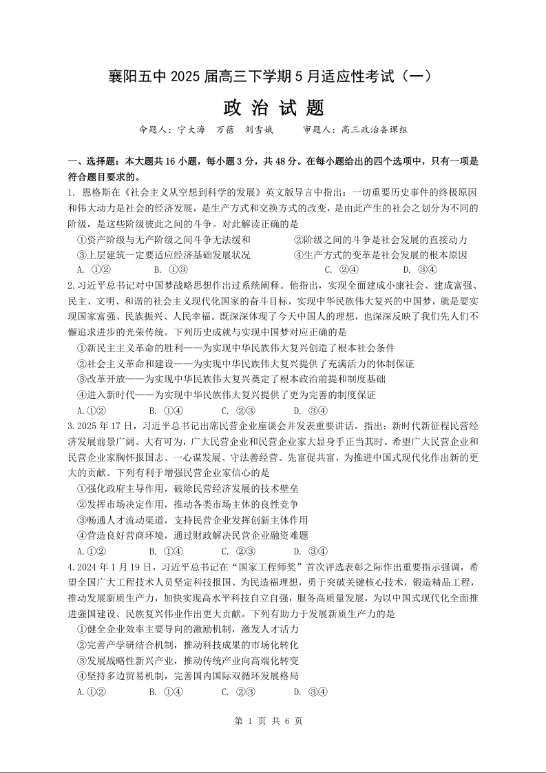 湖北省襄阳五中2024-2025学年下学期5月高三适应性考试(一)政治