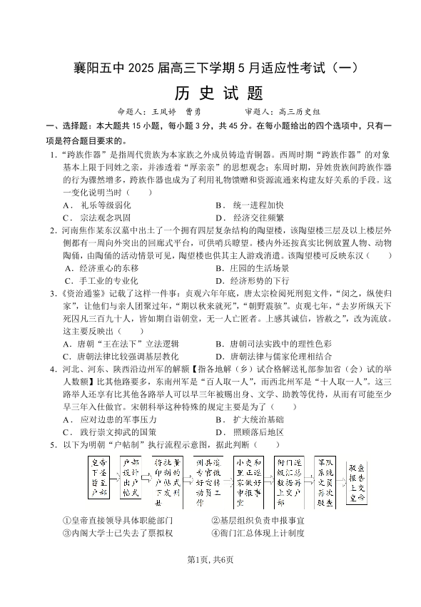湖北省襄阳五中2024-2025学年下学期5月高三适应性考试(一)历史