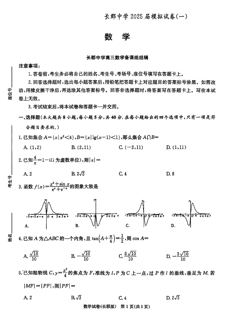 湖南省长郡中学2024-2025学年下学期高三模拟试卷(一)数学+答案