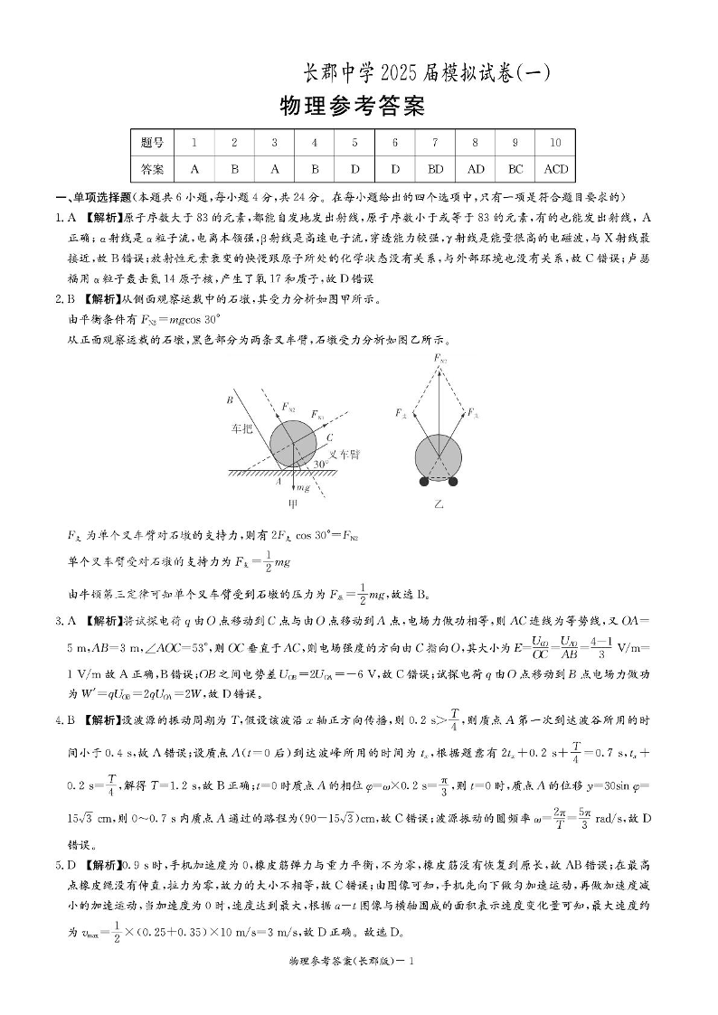 湖南省长郡中学2024-2025学年下学期高三模拟试卷(一)物理答案