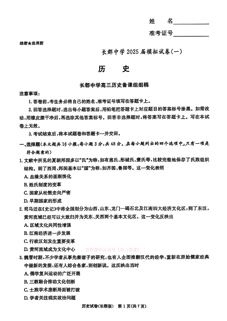 湖南省长郡中学2024-2025学年下学期高三模拟试卷(一)历史+答案