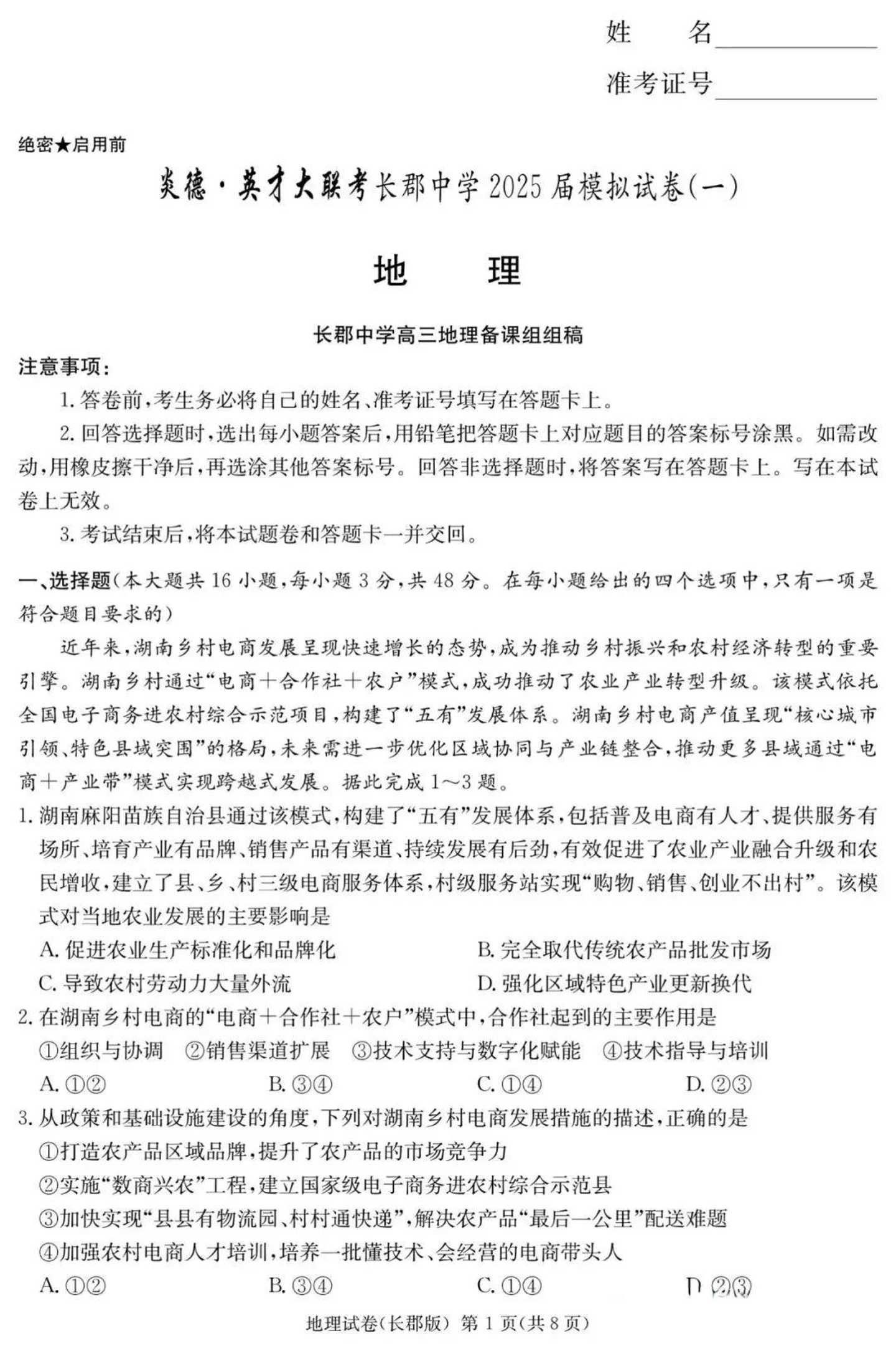湖南省长郡中学2024-2025学年下学期高三模拟试卷(一)地理
