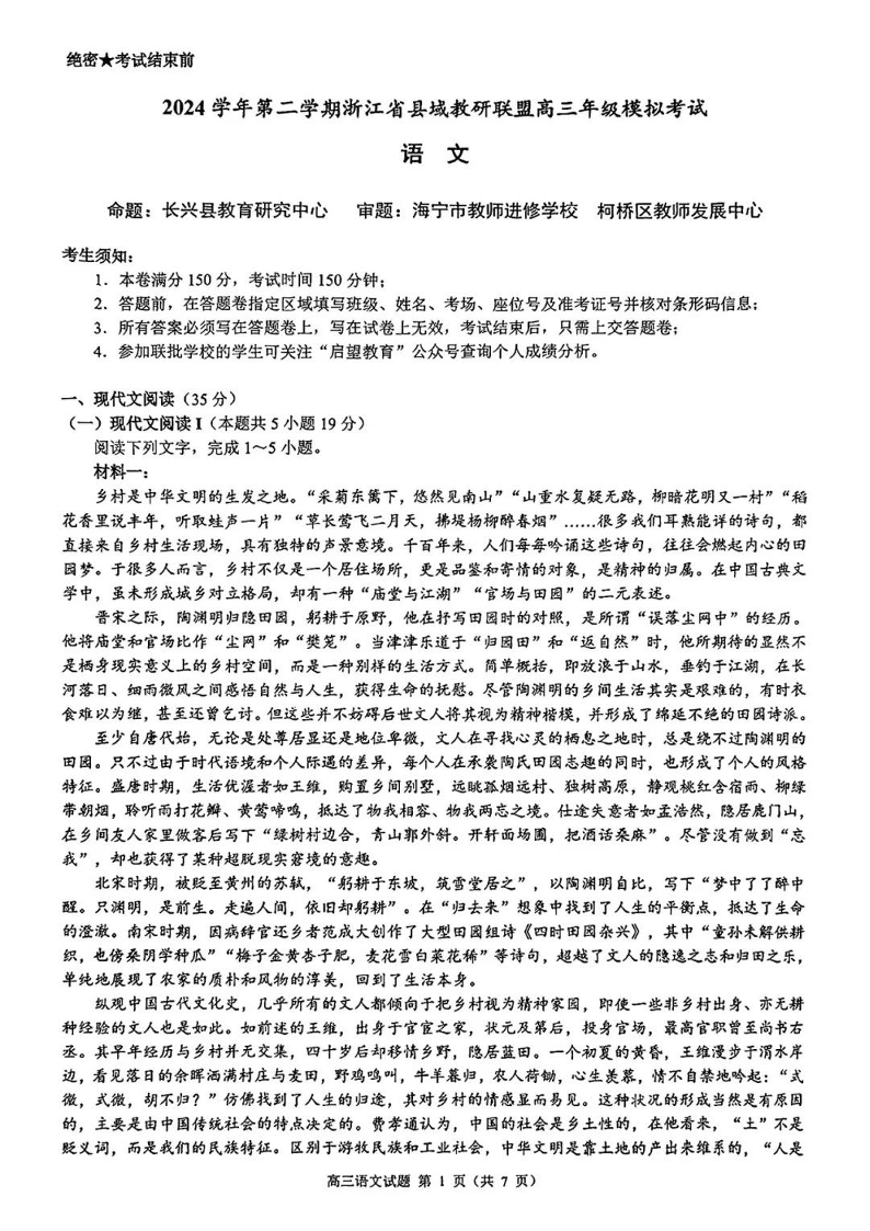 浙江省县域教研联盟2024-2025学年下学期5月高三模拟考试语文+答案