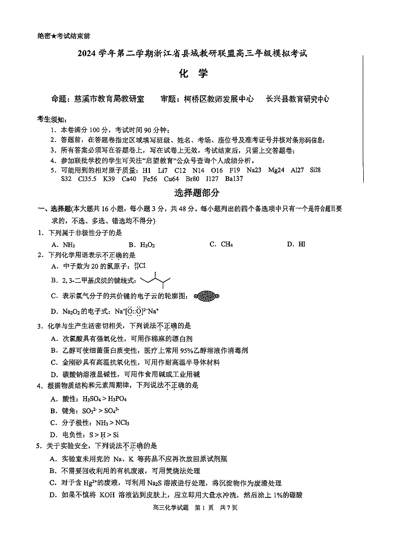 浙江省县域教研联盟2024-2025学年下学期5月高三模拟考试化学+答案