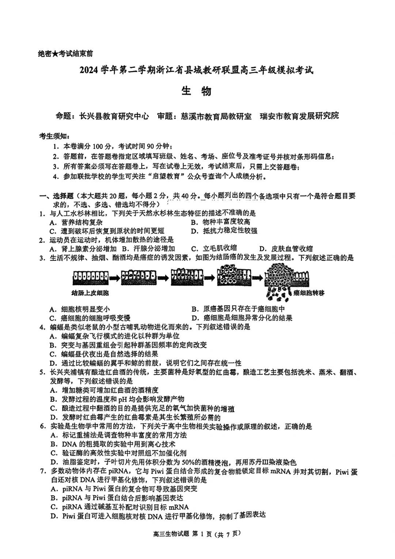 浙江省县域教研联盟2024-2025学年下学期5月高三模拟考试生物+答案