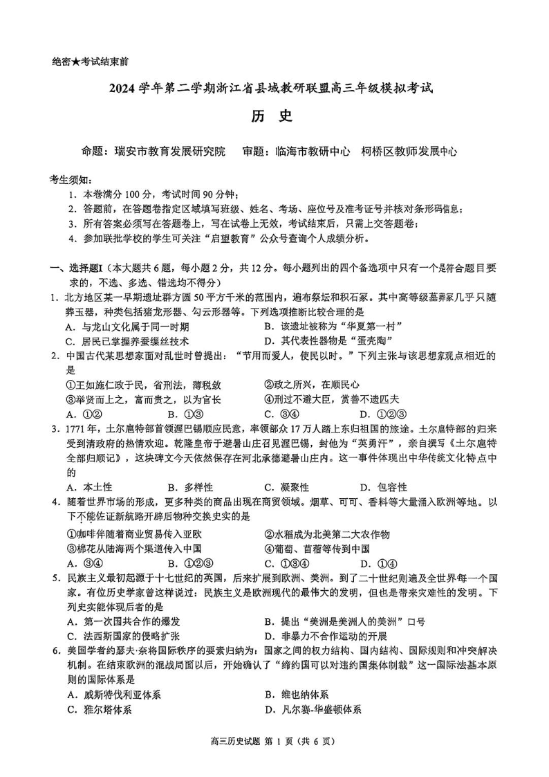 浙江省县域教研联盟2024-2025学年下学期5月高三模拟考试历史+答案