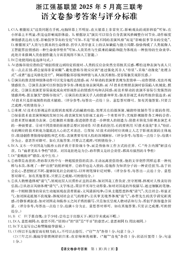 浙江省强基联盟2024-2025学年下学期5月高三联考语文答案
