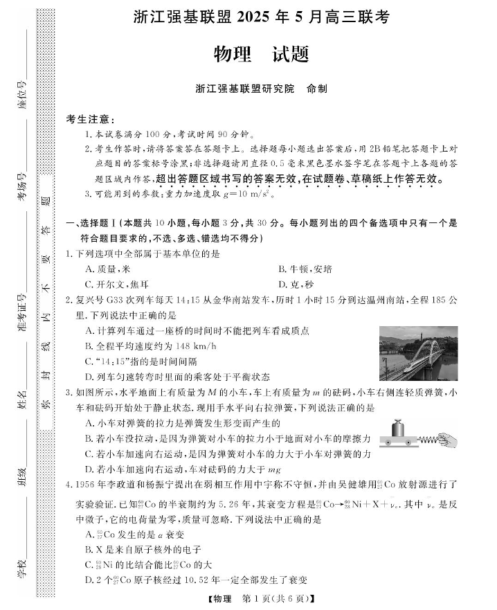 浙江省强基联盟2024-2025学年下学期5月高三联考物理