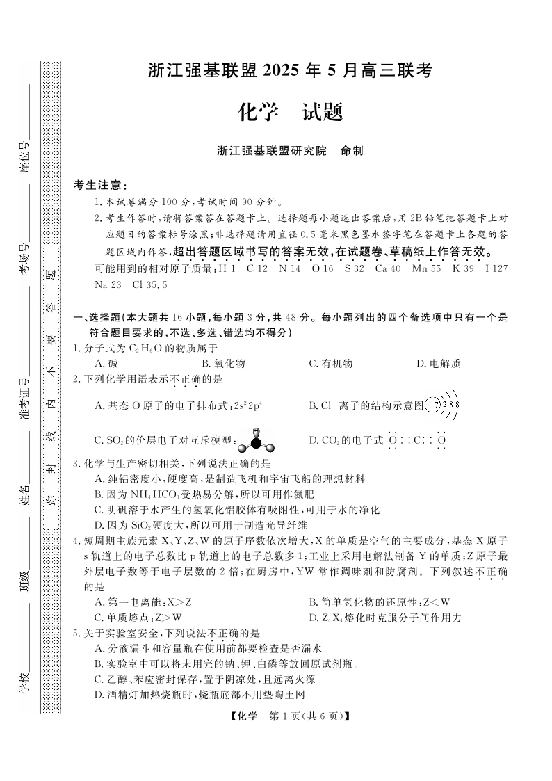 浙江省强基联盟2024-2025学年下学期5月高三联考化学+答案