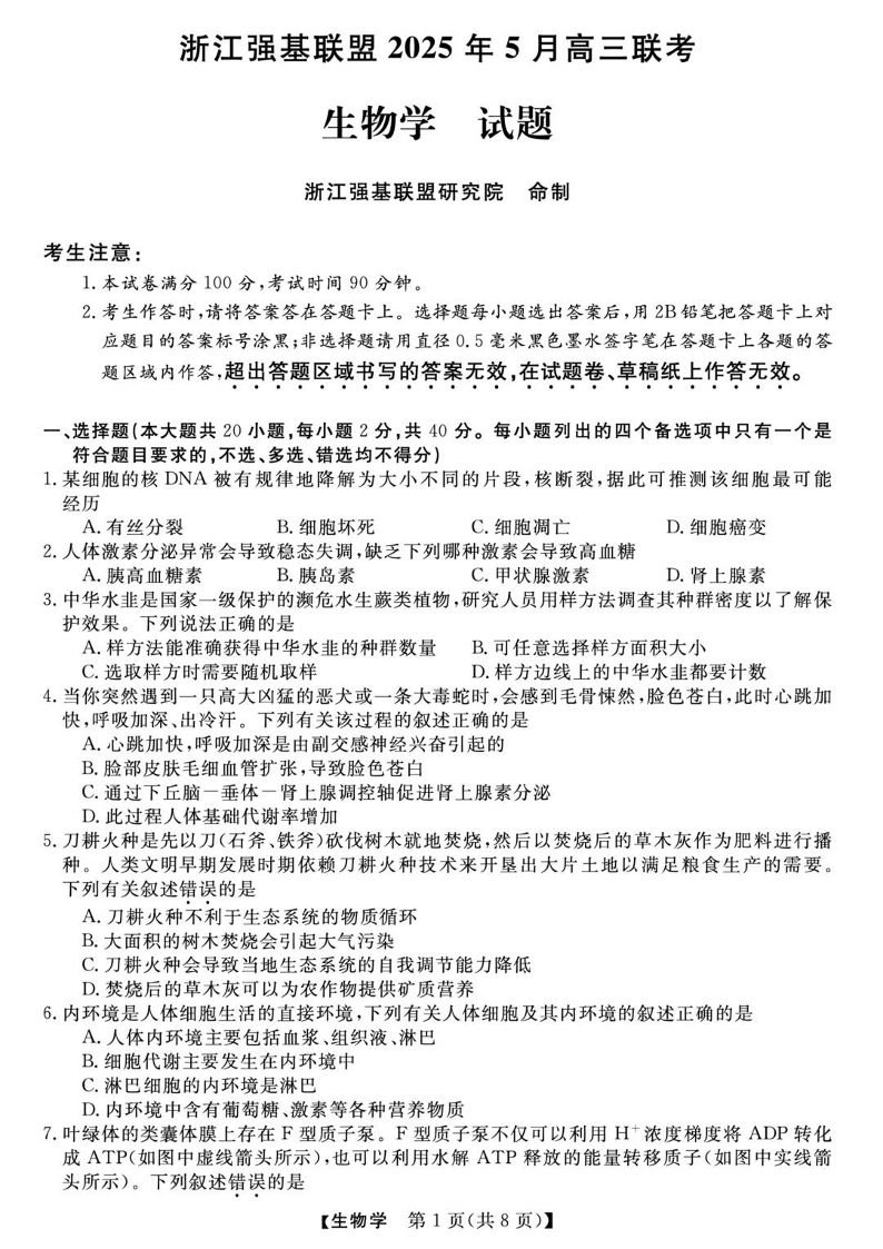 浙江省强基联盟2024-2025学年下学期5月高三联考生物+答案