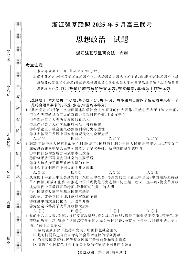浙江省强基联盟2024-2025学年下学期5月高三联考政治+答案