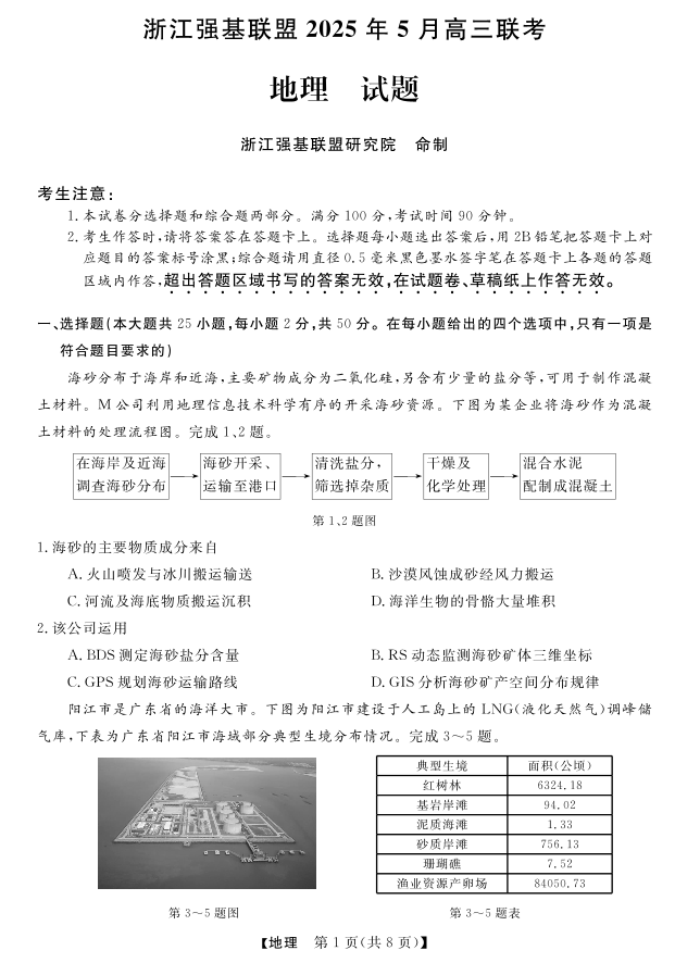 浙江省强基联盟2024-2025学年下学期5月高三联考地理