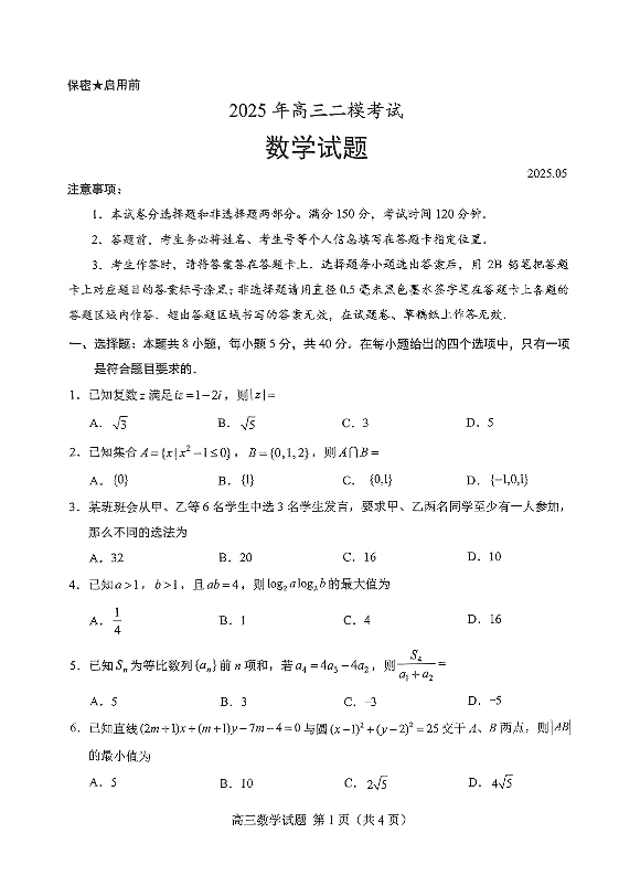 山东省菏泽市2024-2025学年下学期高三二模考试数学