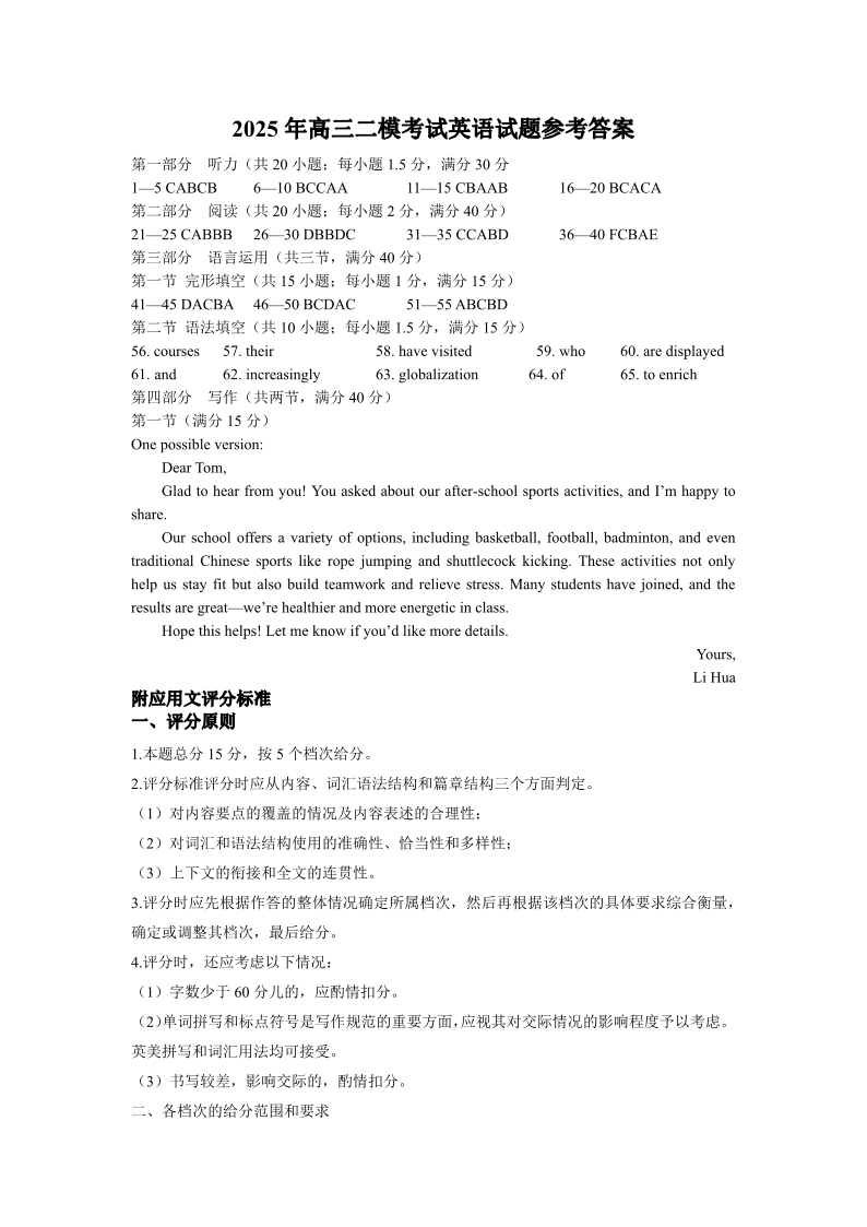 山东省菏泽市2024-2025学年下学期高三二模考试英语答案