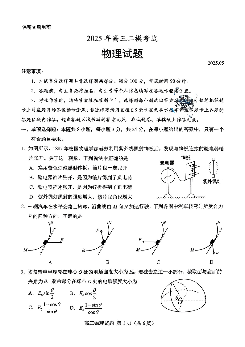 山东省菏泽市2024-2025学年下学期高三二模考试物理