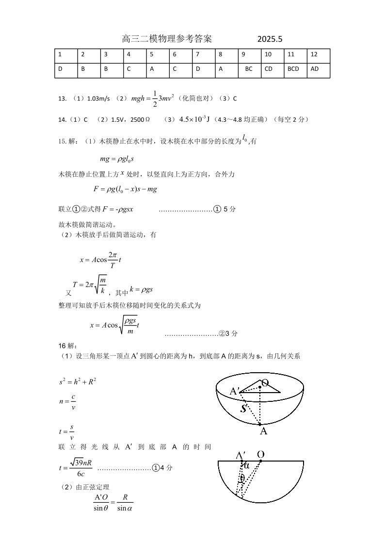 山东省菏泽市2024-2025学年下学期高三二模考试物理答案