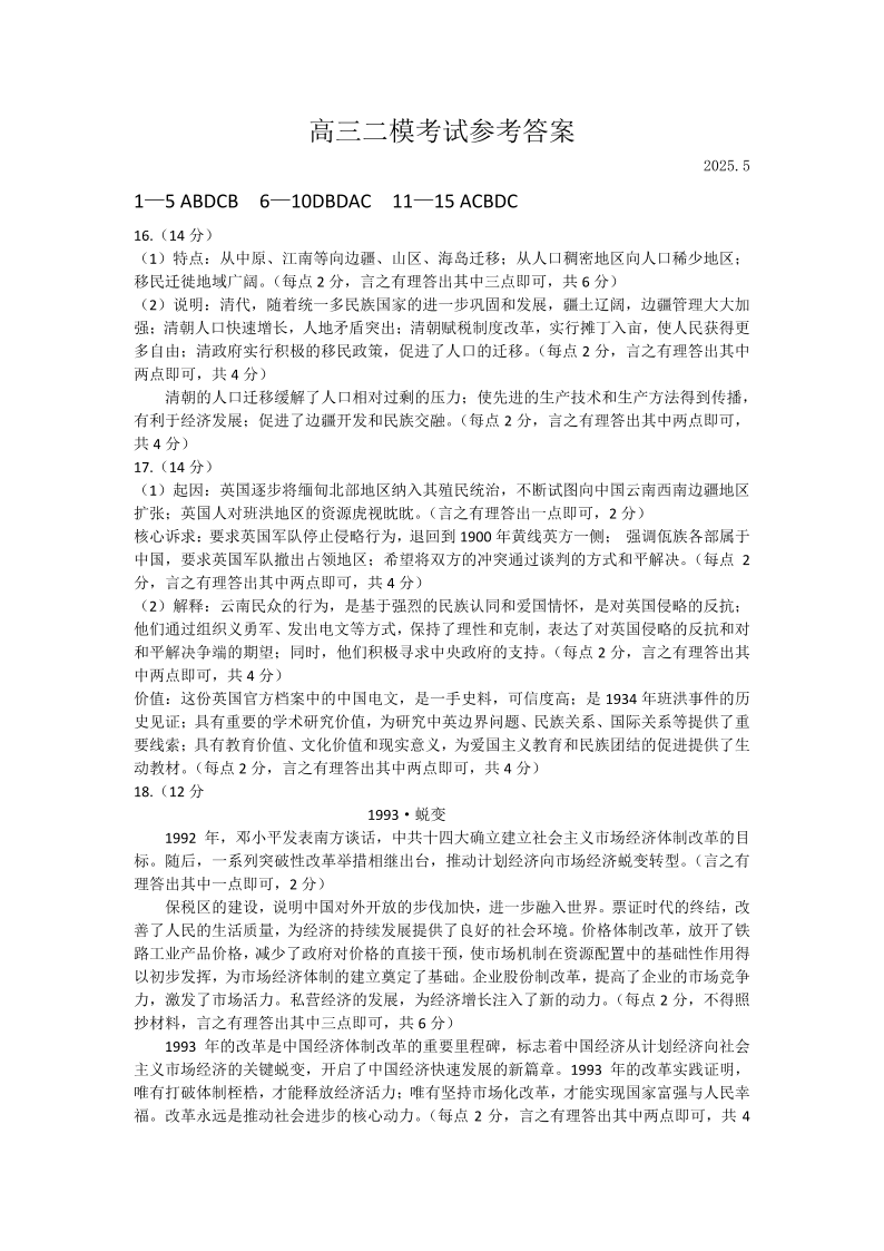 山东省菏泽市2024-2025学年下学期高三二模考试历史答案