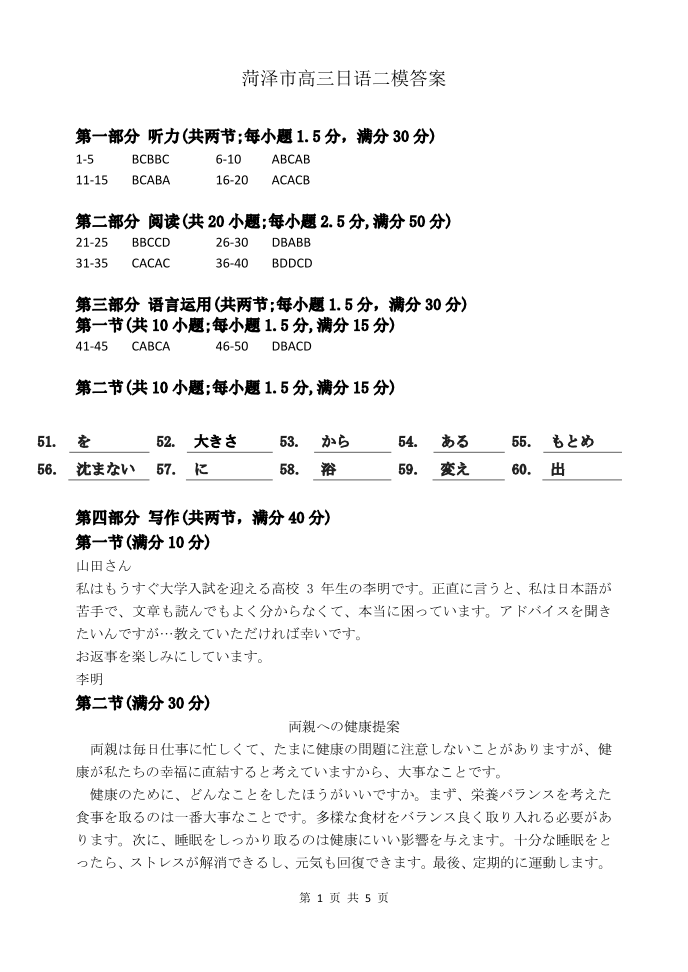 山东省菏泽市2024-2025学年下学期高三二模考试日语答案