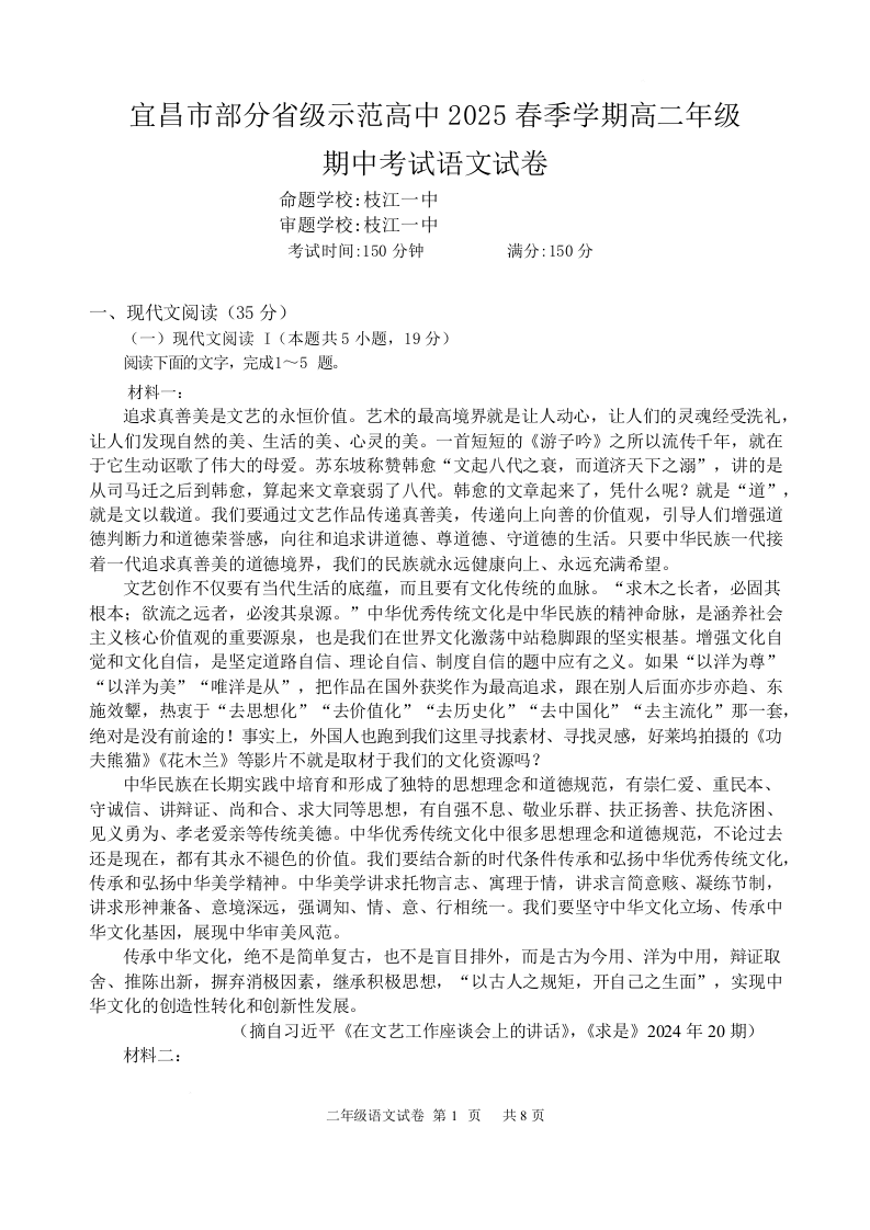 湖北省宜昌市部分省级示范高中2024-2025学年下学期4月高二期中联考语文
