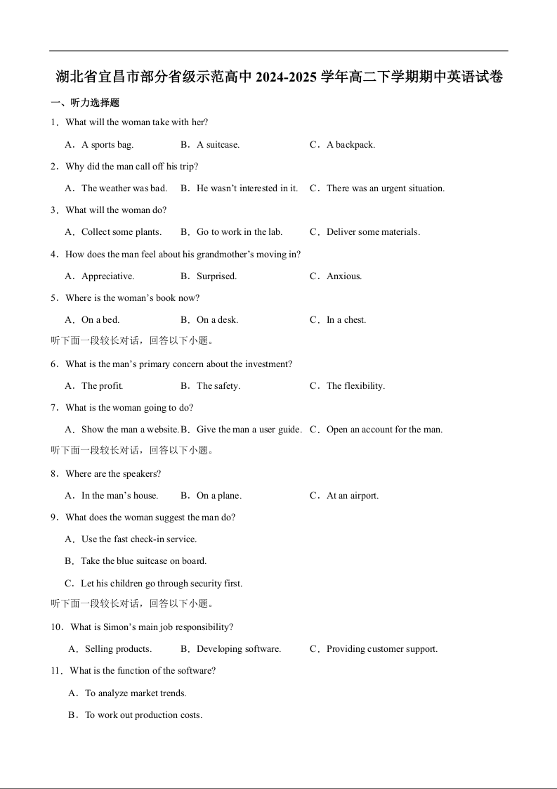 湖北省宜昌市部分省级示范高中2024-2025学年下学期4月高二期中联考英语+答案