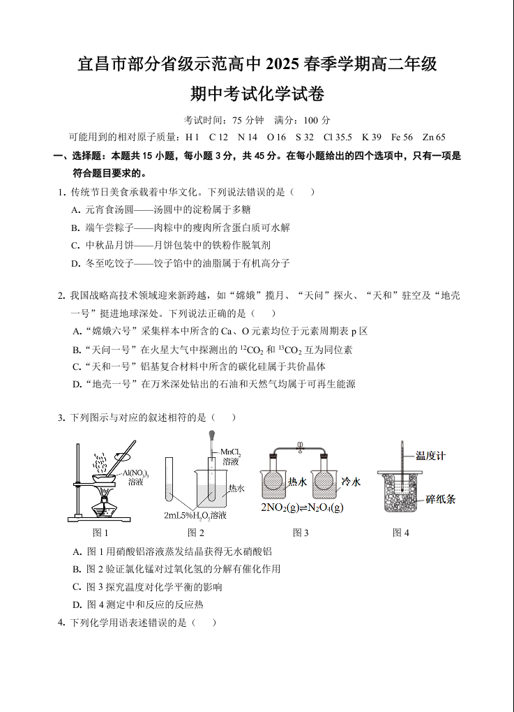 湖北省宜昌市部分省级示范高中2024-2025学年下学期4月高二期中联考化学