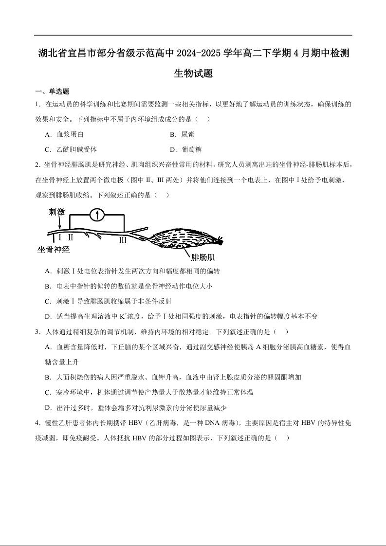 湖北省宜昌市部分省级示范高中2024-2025学年下学期4月高二期中联考生物+答案