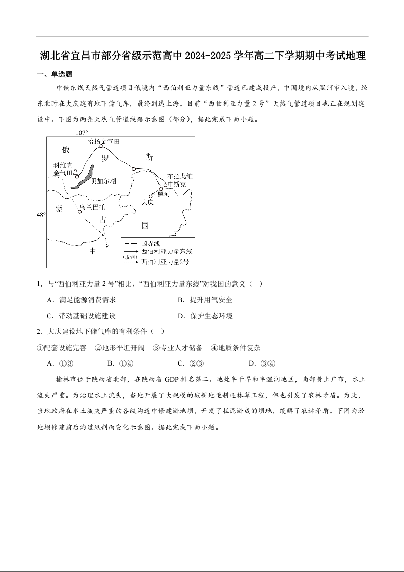 湖北省宜昌市部分省级示范高中2024-2025学年下学期4月高二期中联考地理+答案