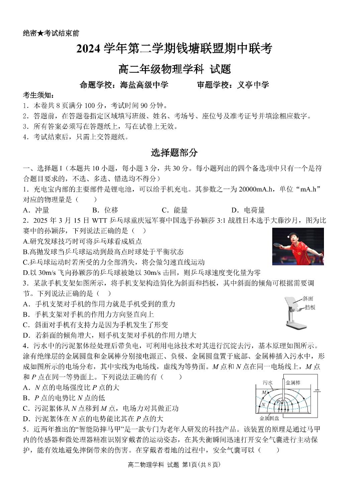 浙江省钱塘联盟2024-2025学年下学期高二期中联考物理+答案