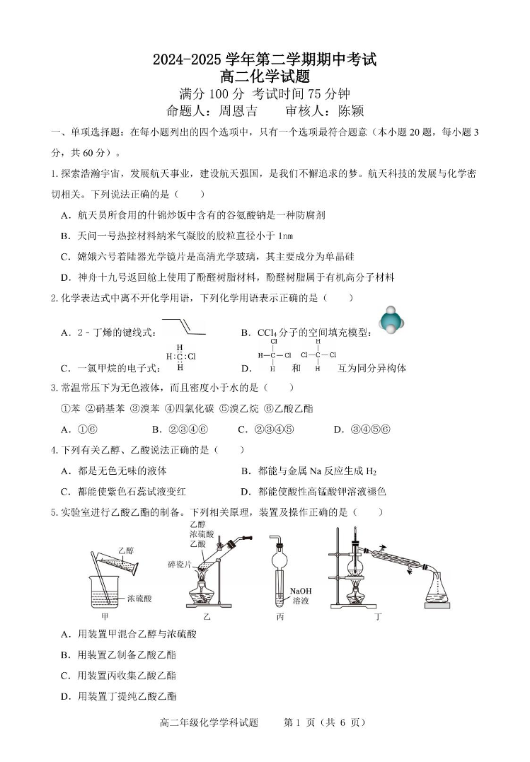 江苏省连云港市区七校2024-2025学年下学期高二期中联考化学+答案