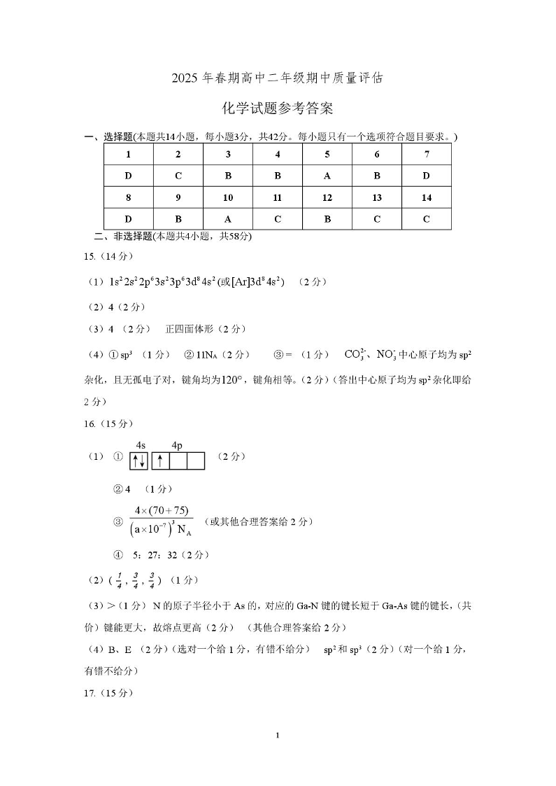 河南省南阳市2024-2025学年下学期4月高二期中考试化学答案