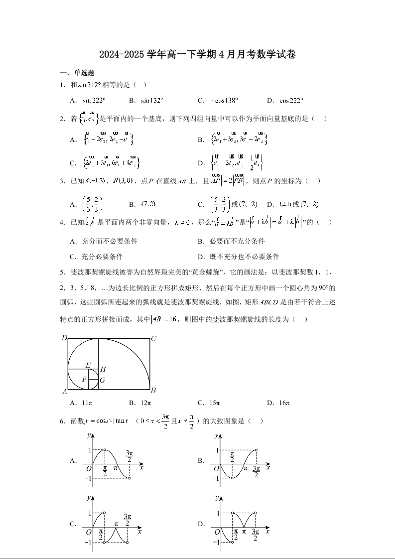 江西省上饶市重点校2024-2025学年下学期4月高一月考数学+答案