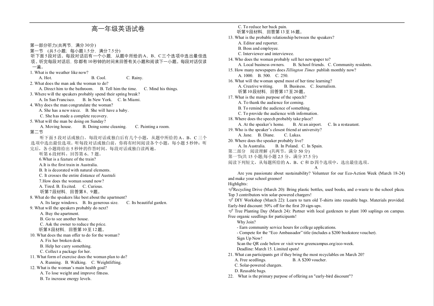 江西省上饶市重点校2024-2025学年下学期4月高一月考英语+答案