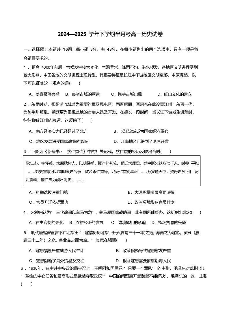 江西省上饶市重点校2024-2025学年下学期4月高一月考历史+答案